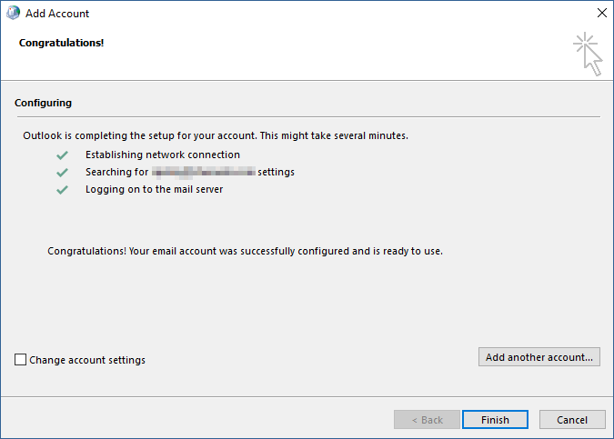 6. Outlook will connect to Autodiscover, and configure your settings automatically. When you see three green checkmarks, click Finish.