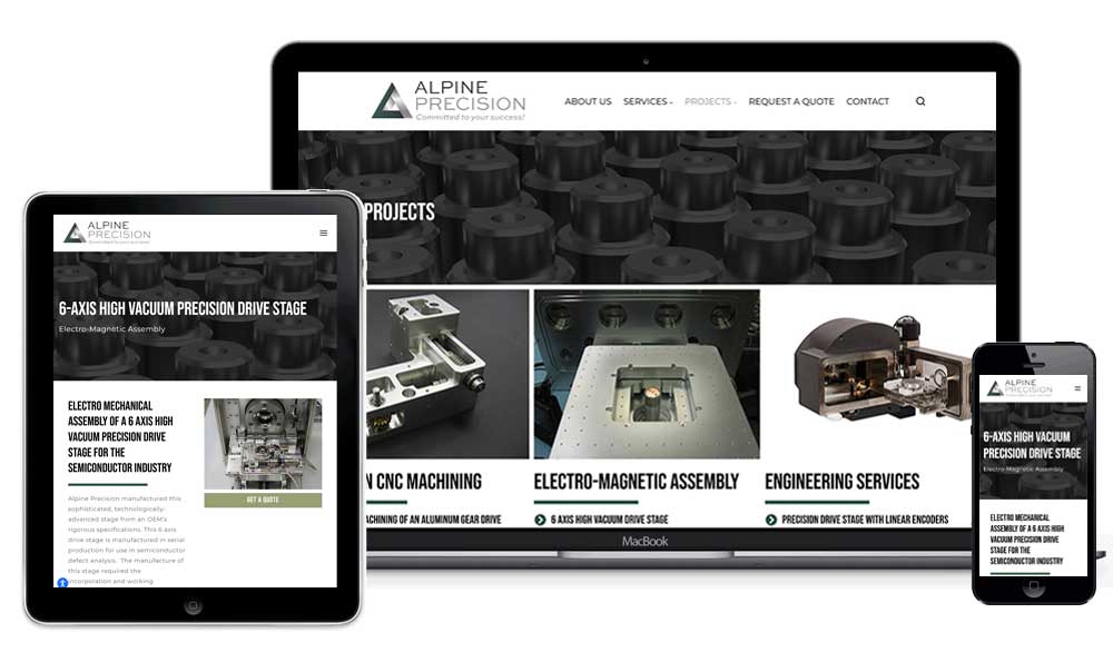 Tidal Media Group worked with Alpine Precision to create an updated brand and website. Starting with a custom-designed logo, we then created the website to showcase their diversified manufacturing support service for precision equipment builders.